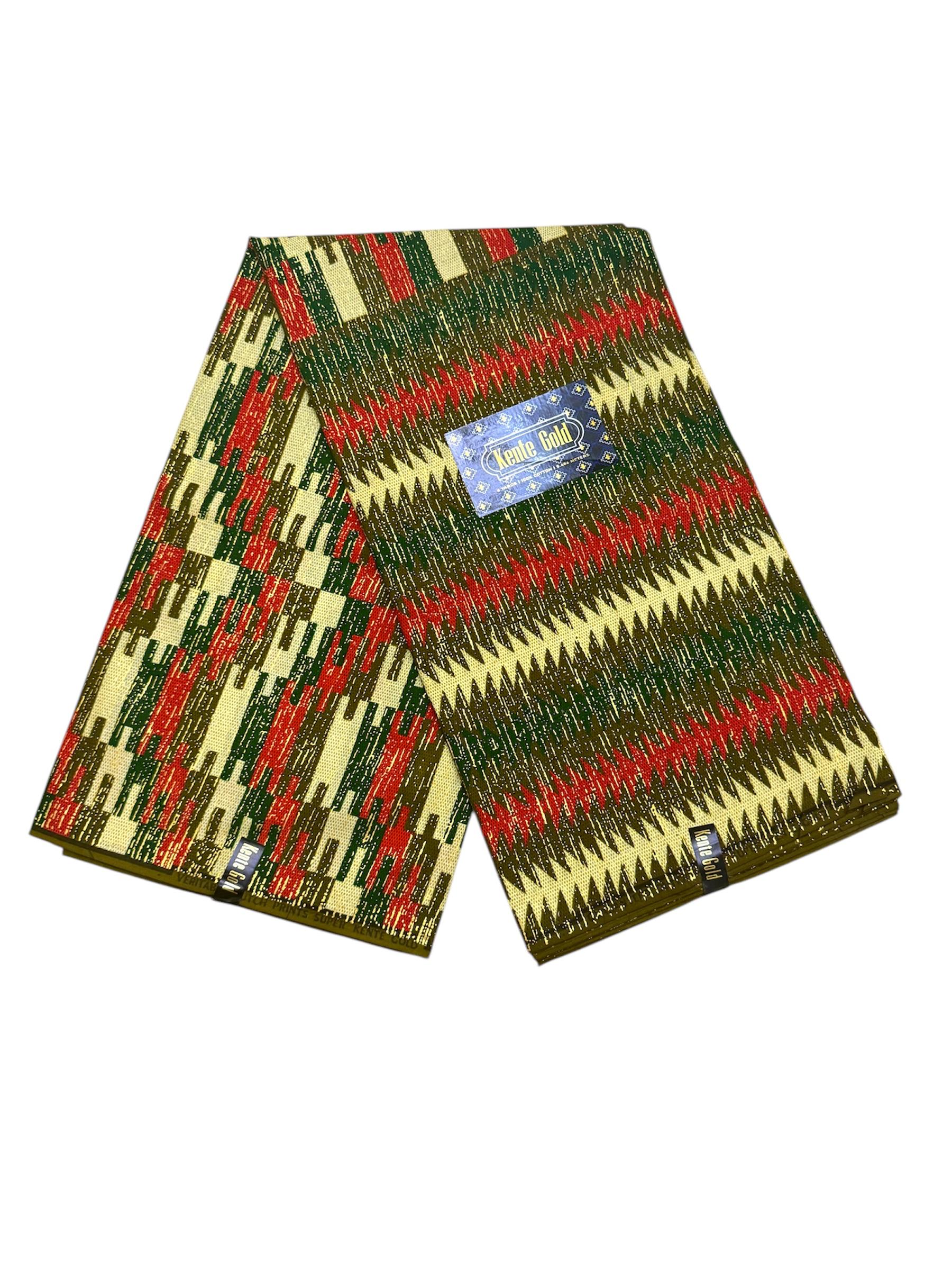 3. Pagne Kente Gold – Tons Chauds et Sophistiqués ce pagne Kente Gold est une ode à la sophistication, avec une palette de couleurs chaudes et harmonieuses. Les tons de vert olive, rouge profond, jaune moutarde et blanc cassé se mêlent dans des motifs géométriques complexes, créant un équilibre parfait entre tradition et modernité. Les lignes zigzagantes dorées, signature emblématique du Kente, apportent une touche de lumière et de prestige à ce tissu. Idéal pour des tenues de mariage, des célébrations importantes ou des créations couture raffinées, ce pagne 100 % coton offre une texture agréable et une durabilité exceptionnelle. Avec ses 6 yards, il est parfait pour laisser libre cours à votre imagination et créer des pièces uniques qui racontent une histoire.