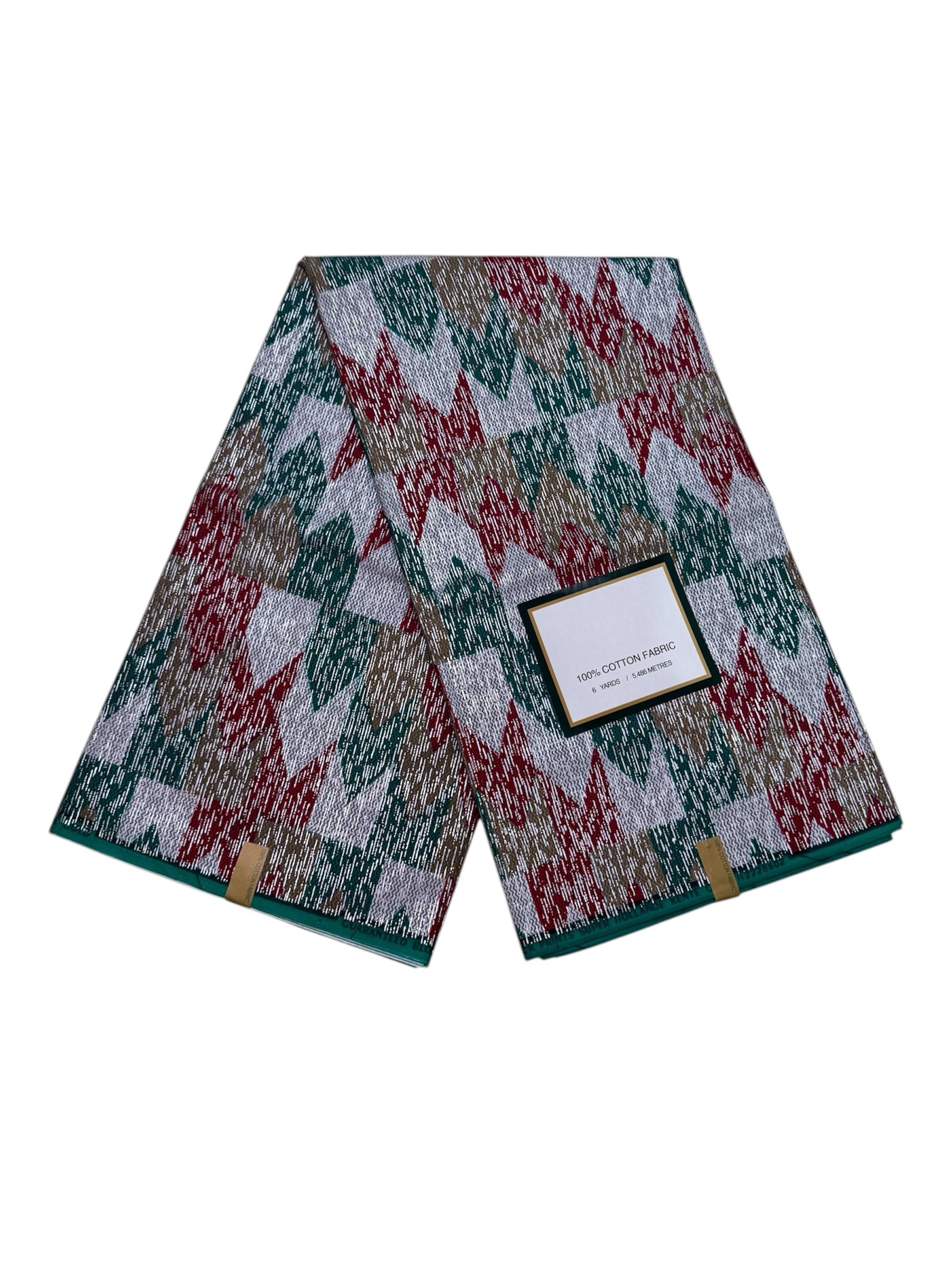 Plongez dans l’élégance et la tradition avec ce superbe tissu en coton 100 %, soigneusement conçu pour allier authenticité et modernité. Ce tissu présente un motif géométrique captivant composé de formes angulaires entrelacées, mettant en valeur une palette de couleurs riches et harmonieuses : des verts profonds, des rouges vibrants et des beiges subtils, le tout rehaussé par des accents argentés qui ajoutent une touche de sophistication. Mesurant 6 mètres de long, ce tissu est idéal pour une variété de projets, qu’il s’agisse de créer des vêtements traditionnels tels que des tenues africaines authentiques ou des pièces modernes et personnalisées. Sa texture douce et sa durabilité en font un choix parfait pour les couturiers amateurs comme professionnels. Disponible sur notre site, ce tissu promet de transformer vos idées en chefs-d’œuvre uniques. Commandez dès maintenant et laissez libre cours à votre créativité !